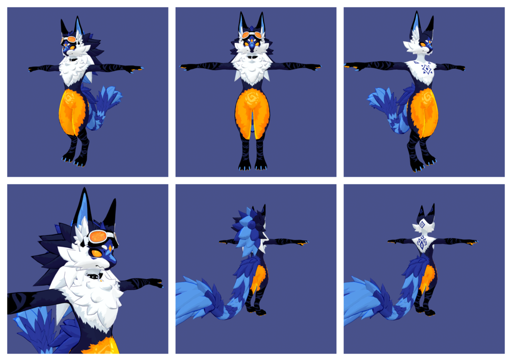 This is a retexture done from scratch for the Novabeast Vrchat avatar! Based on little doodles and critters I've drawn, I've decided to make a colorful, cartoony, little creature for you to use! The base avatar comes with the default blue retexture, 4 glowy and glittery premade shaders (Body, eyes, fluff, and visor), masks for if you want to edit shaders, and a unity package, pre set up with compressed and set up textures and shaders! With the recolor packages, each one has a different symbol on their stomach and a singular pupil on their left eye! Feel free to make a character based off of this, go crazy with it!!